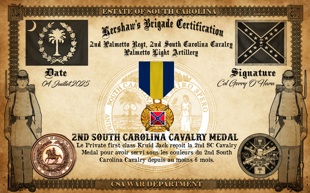 ▄ Pour avoir servi sous les couleurs du 2nd South Carolina Cavalry depuis au moins 6 mois, reçoit la 2nd SC Cavalry Medal le 4.7.2025