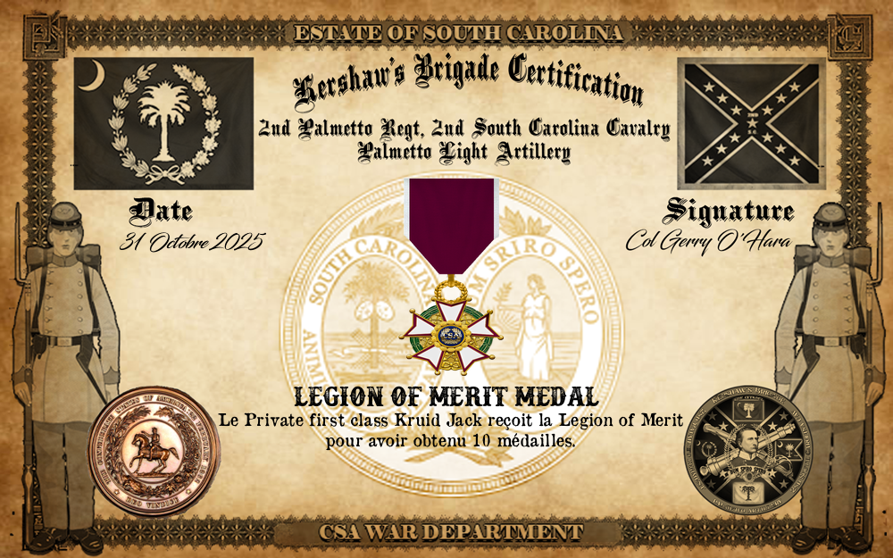 ▄ Pour avoir servi sous les couleurs de la Brigade de Caroline du Sud depuis au moins 6 mois, reçoit la Kershaw's Brigade Medal le 28.2.2025