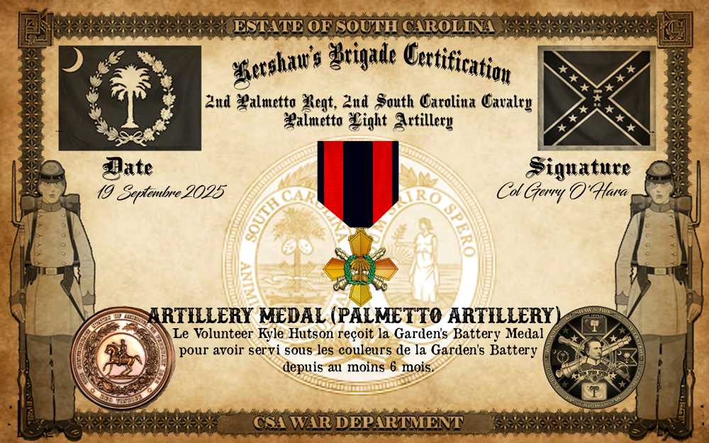 ▄ Pour avoir servi sous les couleurs de la Brigade de Caroline du Sud depuis au moins 6 mois, reçoit la Kershaw's Brigade Medal le 19.9.2025