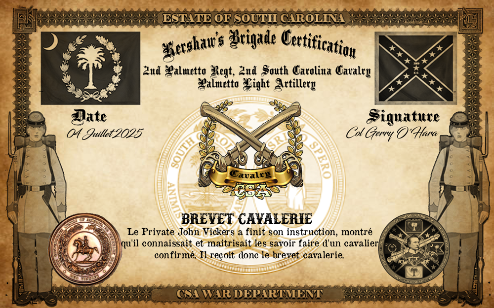 Engagé volontaire pour son incorporation dans l'Armée des États confédérés le 12.12.2024. ▄ Arrivé au corps et affecté au 2nd South Carolina Cavalry le 12.12.2024. ▄ Aux armes le 13.12.2024. ▄ Promu au grade de Private le 28.2.2025
