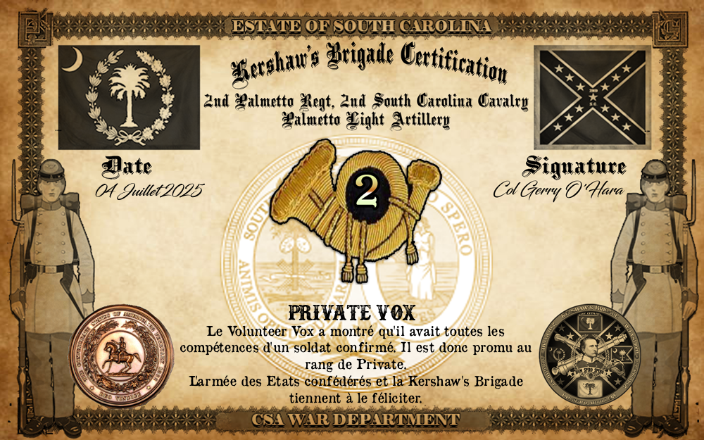 Engagé volontaire pour son incorporation dans l'Armée des États confédérés le 4.3.2025. ▄ Arrivé au corps et affecté au 2nd Palmetto Regiment Company B le 4.3.2025. ▄ Aux armes le 10.3.2025. ▄ Promu au grade de Private le 4.7.2025 ▄ Sur décision du commandement, est muté à la Garden's Battery A le 4.7.2025 ▄