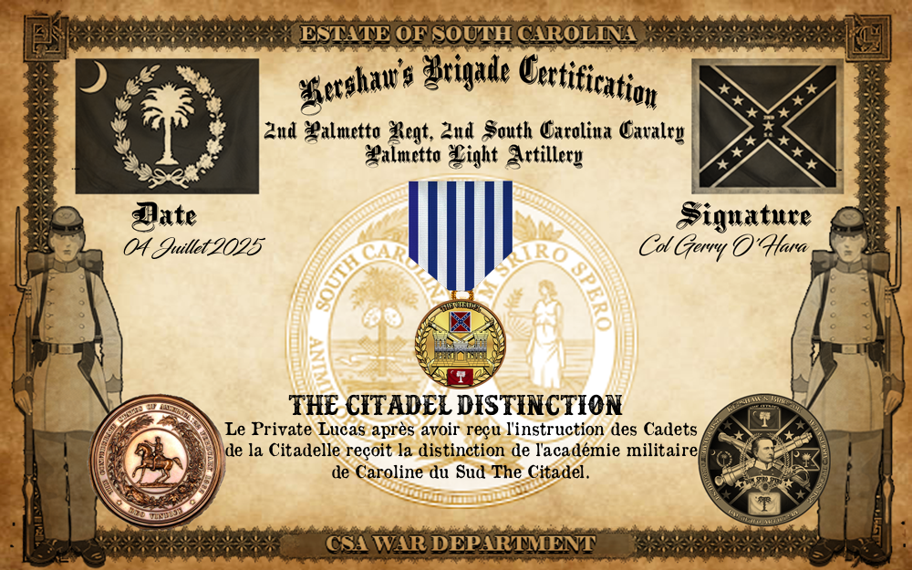 Engagé volontaire pour son incorporation dans l'Armée des États confédérés le 29.4.2025. ▄ Arrivé au corps et affecté à la Garden's Battery A le 29.4.2025. ▄ Aux armes le 5.5.2025. ▄ A finit son instruction d'artilleur et a montré qu'il connaissait et maitrisait les savoir faire d'un artilleur confirmé. Il reçoit donc le brevet artillerie le 16.5.2025